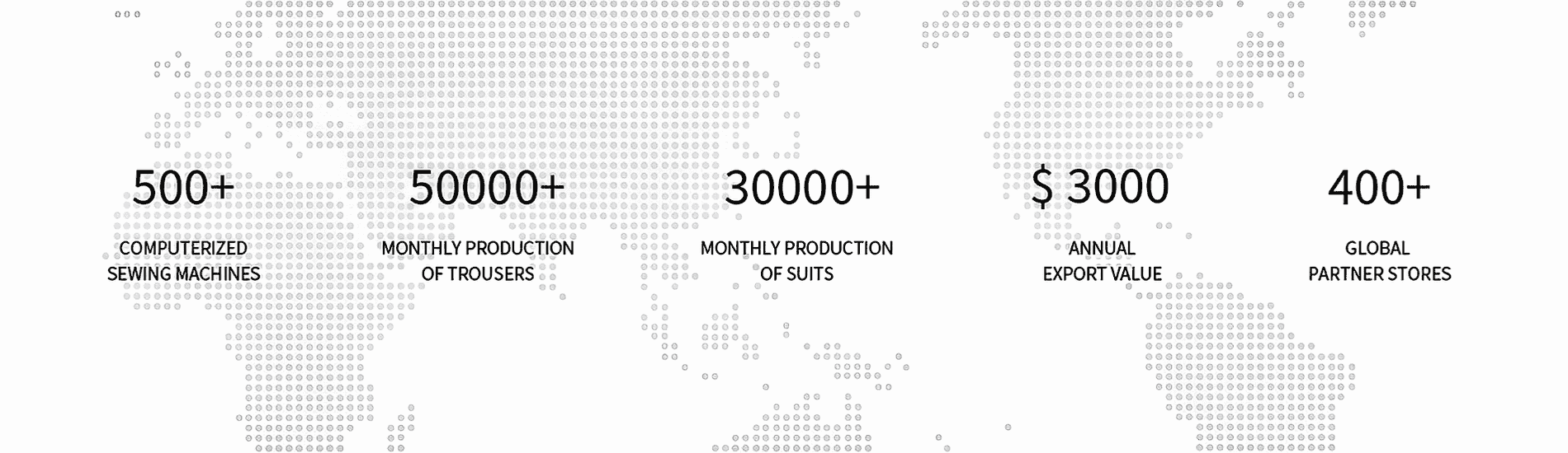 لدينا قوة عاملة تزيد عن 500 موظف وأكثر من 500 ماكينة خياطة محوسبة، مع ورشة إنتاج بالجملة وورشة إنتاج مخصصة. بحيث لا نقدم فقط خدمات المعالجة المجمعة لـ OEM، بل نقدم أيضًا خدمات التخصيص الخاصة المتطورة. قدرة ورشة الإنتاج بالجملة: 50000 زوج من السراويل و30000 قطعة من السترات شهريًا، قدرة ورشة الإنتاج المخصصة: 10000 مجموعة من البدلات شهريًا. يتم تصدير منتجاتنا إلى أكثر من 20 دولة بما في ذلك أوروبا وأمريكا، مع مبيعات تصدير سنوية تبلغ 30 مليون دولار أمريكي وشراكات مع أكثر من 400 متجر بيع بالتجزئة حول العالم.